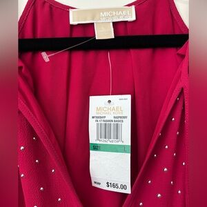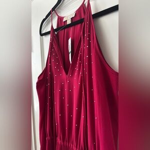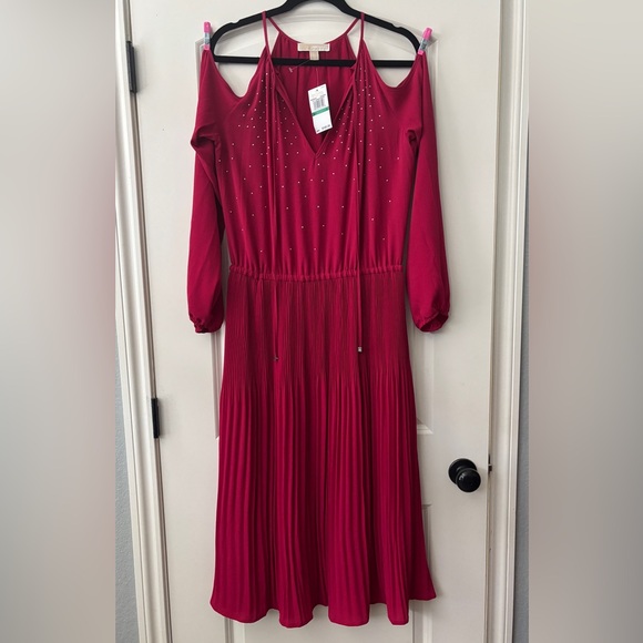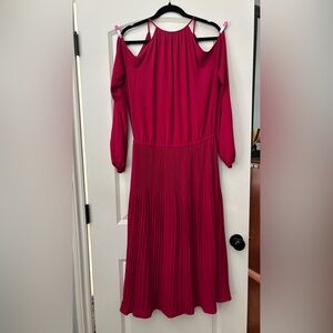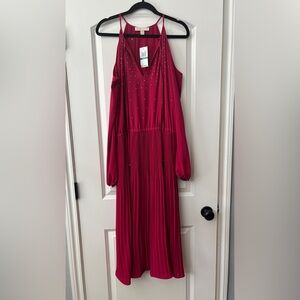 Chic raspberry dress featuring elegant rhinestones. Ideal for special events. Off the shoulder cut out, halter neck, long sleeves. Nwt size large