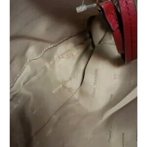 This is a large double handle shoulder bag by Michael Kors. It is in a beautiful crimson red pebbled leather. It has 3 divided sections with a main magnetic closure and the center section has a zippered closure. It is lined with a Signature Logo tan/beige fabric. It has lots of interior card slots and slip pockets and one interior zippered pocket. It has one key strap and is very clean with two small spots on one side (see pictures). The outside has some minor wear on the corners, piping, handles, and feet. The gold tone hardware is in good condition. It measures approximately 12"Wx10"Hx4.5"D with an approximate 10" handle drop. This is a Pre-owned item with minor wear, but still in good usable condition.