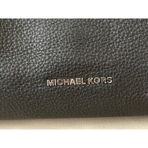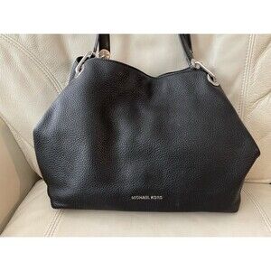 The Michael Kors Raven Pebbled Leather Shoulder Bag in black is a stylish and spacious accessory for women. With silver hardware accents, this large bag features a pebbled leather exterior and a zip and magnetic closure for secure storage. The double black leather handles and 10-inch strap drop make it easy to carry for everyday use. Additionally, inside the bag, there are inner pockets for organization, making it both functional and fashionable. Made by Michael Kors, this signature bag is a timeless addition to any wardrobe.