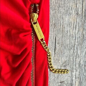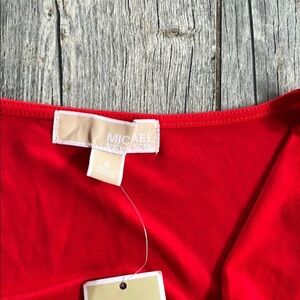 This striking red dress by Michael Kors features an asymmetrical wrap design with elegant ruching, perfect for a night out. The sleeveless style and unique neckline add a modern touch to this cocktail-ready piece. Its soft, draping fabric ensures a flattering fit and graceful movement.