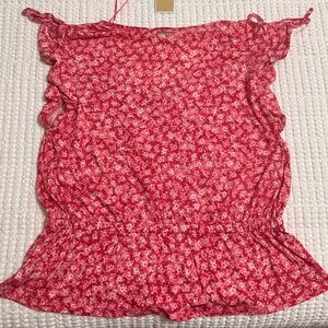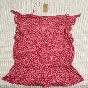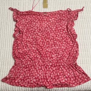 Chic red floral crop top. Features ruffled sleeves and a flattering V-neck. Perfect for casual outings.