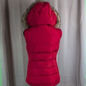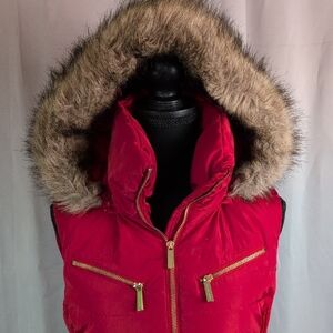 This vibrant red vest by Michael Kors showcases a stylish quilted design and a cozy faux fur-trimmed hood, making it a chic addition to your outerwear collection. Its fitted silhouette ensures a flattering fit, perfect for layering during cooler weather.