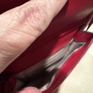 The Michael Kors Red Saffiano Leather Shoulder Bag is a stylish and luxurious accessory for women. Made from high-quality leather with a pebbled finish, this large rectangular bag features a bold red exterior and gold hardware accents. It includes a zip closure and inner pockets for organization, making it both fashionable and functional. This designer bag from Michael Kors adds a touch of sophistication to any outfit, perfect for those who appreciate high-end fashion and quality craftsmanship. Please see pics of interior, some black marks on small interior zipper compartment.