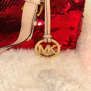 Shimmer with this stunning red sequin satchel. Features gold-tone hardware and signature MK charm. Never carries, new in protector bag. Detachable strap.