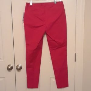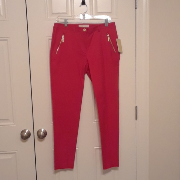 These cheerful and bright brand new Michael Kors basic tapered leg pants are a refreshing departure from the normal classic red pant. These pants feature working and functional zippered pockets on either side as well as a button and zip closure and belt loop. The tapered leg design does not taper fully but leaves a wider than tapered classic fitted look and the shell lining ensures that the panels don't twist or turn. Both the lining and exterior are 97% cotton/3% elastane & machine washable!