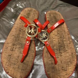 Chic red thong sandals with signature gold MK logo. Ideal for summer wear.