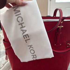 Elegant red tote with gold accents. Features signature MK pattern. Spacious interior with side pockets.