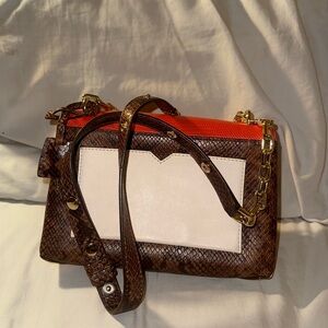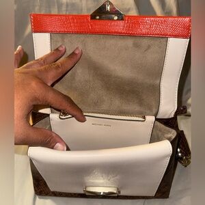 Chic Michael Kors shoulder bag in vibrant red and brown. Gold chain strap adds elegance. Textured finish enhances style.