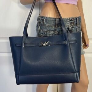 Michael Kors Reed Large Leather Belted Tote Shoulder Purse Bag + Wallet Set Navy