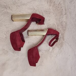 Michael Kors Retro 70s 80s Gorgeous Red Suede and Gold Glam Platform Heel, 70s style, Studio 54 glam, slight wear on inside of left strap, unnoticeable on(pics), Classic, Glam, Vintage Style, Throwback, Feminine, Leather, Suede, Bohemian, Bianca Jagger, Rocker, Boho Luxe, Hippie, Indie Sleeze
