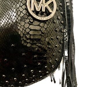 Michael Kors boho-glam bag. • Patent Python • 24-26" Adjustable Strap • Interior Details: One Zip Pocket, Three Open Pockets, One Cell Phone Pocket, One Key Fob • 14" X 4" X 15" • Magnetic Closure • Imported