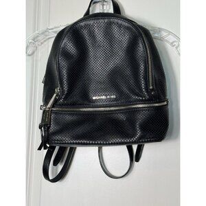 Michael Kors Rhea medium backpack. Perforated leather. Adjustable straps. Large main compartment with multiple interior pockets, 1 with zipper. Clip for keys. 2 additional exterior pockets.