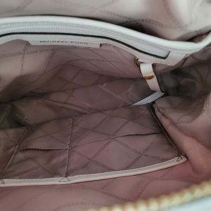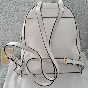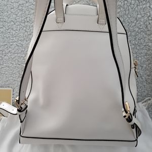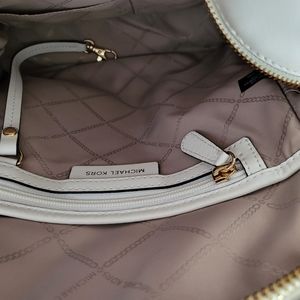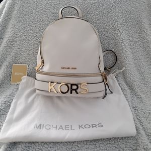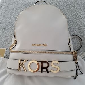 Beautiful white Leather w/gold logo KORS MK Rhea backpack, only used 2x. Has great space on the inside, has a zippered pocket and additional pouches. 2 additional zippered sections for smaller items. Its clean inside and out and is in a smoke free home. Comes with the bag. It's a great bag, I just want something smaller.