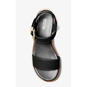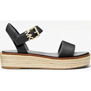 The Michael Kors Richie Espadrille Sandals in Black Leather with a platform heel and MK logo accents are a stylish and versatile choice for Women size 9.5. Featuring a mid-height wedge Heel, Ankle Strap Closure, and Adjustable strap, these sandals are perfect for both Party and Casual Occasions During the Summer and spring seasons. The Black color and solid pattern add a touch of sophistication to the designer shoe from the Michael Kors Logo collection.