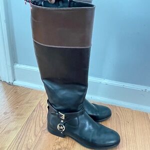 Michael Kors Riding Boots Black Brown Leather Logo Buckle Tall Boots 6