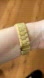 Cream horn acrylic bracelet, knurled gold tone top ring case. Cream mother of pearl dial. Crystal indexes, three sundials. Stainless steel yellow gold plated.