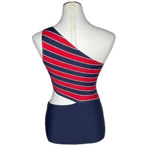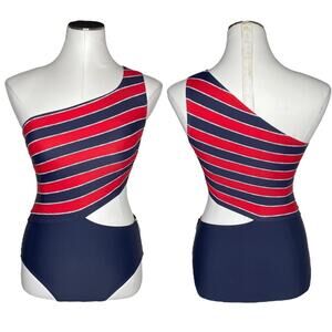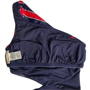 Michael Kors Rope Rugby Stripe One Shoulder Cut Out One-Piece Swimsuit with gold tone zipper detail. Size 6. Clean gusset. No flaws of any kind, it’s in excellent condition.