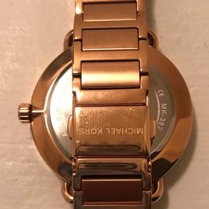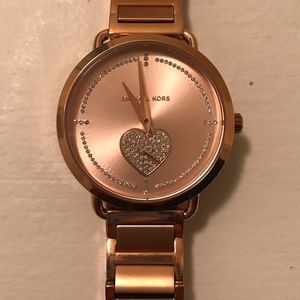 Rose gold watch with heart/crystal detail. Has never been worn/used since purchase. Has been stored in a watch case since purchase. No scratches. Pictures don't show the color very well but it is rose gold.