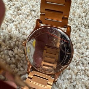 Chic Michael Kors watch in rose gold. Sleek design with a polished finish. Ideal for elevating any outfit. Excellent condition. Very minor wearing. Comes with extra pins and links. Needs a new battery.