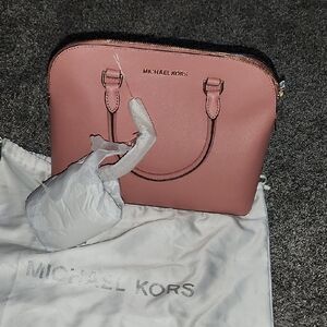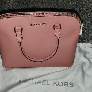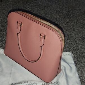 Chic rose satchel with sleek design. Features dual handles and zip closure. Ideal for stylish outings.