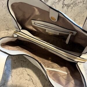 Michael Kors Rosemary Hobo Shoulder Bag in White pebbled leather with Gold-tone hardware. Beautiful bag with lots of storage. Condition: Gentle use. Pen mark on exterior, what looks like a glue stain near zipper. Interior is clean. Please see all photos, thank you!