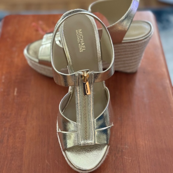 Brand new (with tags & box) Michael Kors Roslyn wedge sandals, shiny metal faux leather, pale gold, size 8.5M.