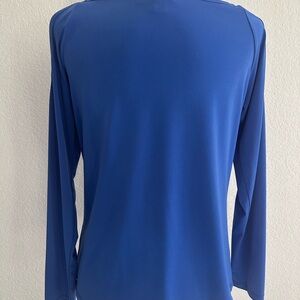 This is a Michael Michael Kors women’s long-sleeve blouse in a rich cobalt blue. It features a wide bateau neckline, cold shoulder with elegant gold-tone chain link accents at the shoulders, adding a touch of metallic detail and subtle glamour. The fabric has a smooth, fluid drape that offers a flattering fit, and the design provides a chic balance between casual and dressy—perfect for pairing with tailored pants, skirts, or denim.