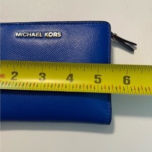 Elegant leather wallet by Michael Kors. Features a vibrant blue color. Sleek and stylish.