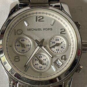 Gently used Michael Kors Silver Runway Watch, model MK5076, is designed with a stainless steel bracelet-style band. It features a silver dial with three chronographs for tracking minutes, seconds, and 24-hour information, along with a date window at the four o'clock position. The watch incorporates luminous stick markers and hands for enhanced visibility in low-light conditions. Built for durability, it includes a mineral crystal and quartz movement, and is water-resistant up to 330 feet (100 meters). In general, suitable for swimming and snorkeling, but not scuba diving NEEDS a new battery.