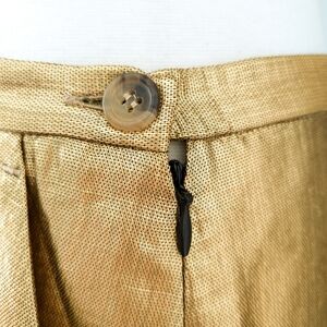 Metallic gold textured fabric cocktail party skirt. Made in Italy. Side pockets. Back kickpleat slit. Side button and zipper closure with keyhole exposed opening (see photo). Full satin lining.