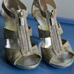 Michael Kors Sandals, Women Silver Glitter Open Toe T-Strap Zipper Berkley, 4" heel, Shoes are in great shape, Only worn twice. Comes with the original box.
