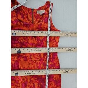 This is a Michael Kors sleeveless sheath dress in size 4, featuring a round neckline, zip closure, and a colorful orange/red color burst design. Made of a combination of 98% cotton and 2% spandex, the knee-length dress is lined and has stretch for comfort. It is suitable for various occasions such as travel, weddings, parties, and workwear, with accents of a zipper with logo detail. back slit still sewn shut.