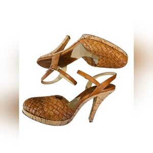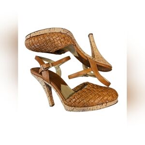 Michael Kors SZ 7 Caramel Woven Leather Cork 4" Heel Closed Toe Ankle Strap Shoe