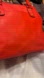 Michael Kors Saffiano Leather Satchel in a red-orange (mandarin) hue, accompanied by a matching card holder wallet. The satchel features a dome shape, dual top handles, a removable and adjustable shoulder strap, and gold-tone hardware including a logo plate.
