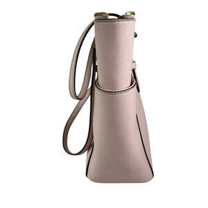 Elevate your everyday look with this sophisticated Michael Kors tote bag in a soft pale pink saffiano leather. Featuring elegant gold-tone hardware, buckle detail straps, and a signature MK medallion charm, this bag combines style and practicality. The spacious interior includes a zippered pocket, slip compartments, and a durable logo-lined fabric, making it ideal for work, errands, or travel.