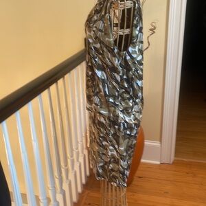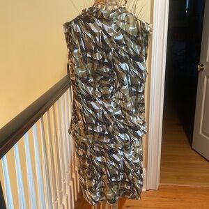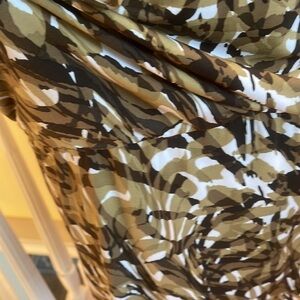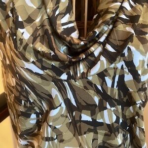 Has elastic band that pulls to the waist. It’s green brown black and white