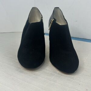Suede upper. Round toe covered heel. Side zip. Leather lining.