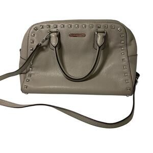 Michael Kors Sandrine Dove Gray Silver Studded Pebble Leather Satchel Handbag. Has an adjustable and detachable strap. I always got compliments on this bag. I no longer like to use large handbags and prefer small cross body bags, so letting this go. I also have the coordinating wallet in my closet for sale.