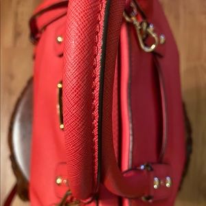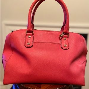 This beautiful watermelon (peachy) colored leather satchel with gold grommets is an eye catcher for any season! It’s interior polyester lining has minor staining (noted in picture) and a small scratch on the exterior base. In great condition otherwise and is quite a deal!