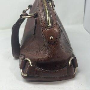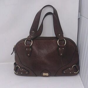 Preowned. Notice very small ink spots inside as pictured. 14 inches in length width is 6 inches height is 8 inches strap drop is 7 inches. On backside notice a small spot on lower left corner as pictured also slight scuff on the top.