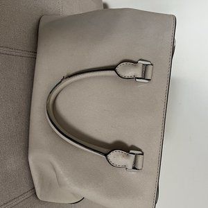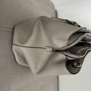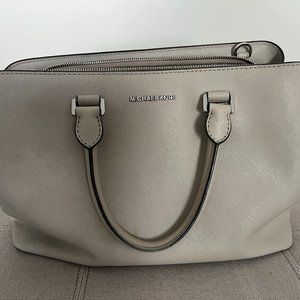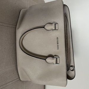 This beautiful authentic leather Michael Kors handbag has been well-loved. It does need to be wiped down, but there are no rips or tears. It's a gray-ish cement color. There are many pockets and compartments. Originally purchased in 2017.
