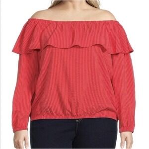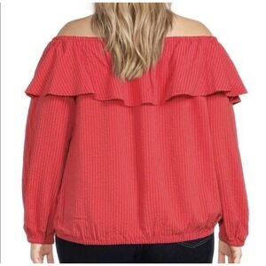 Brand new with tags! This Michael Michael Kors seersucker blouse is the perfect lightweight top for spring and summer. Designed in a beautiful Sangria pink tone with subtle tonal stripes, it features an off-the-shoulder neckline with a playful ruffle overlay, long sleeves with elastic cuffs, and an elastic hem for a gently billowy silhouette.