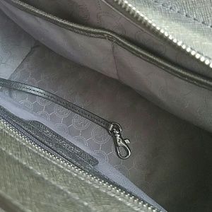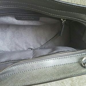 Brand new w/o tags silver handbag. Made from Saffiano leather. This bag is free of any stains on the lining or exterior. It has the key clasp intact. Bought in Dec of 2014 from Dillards and barley used. It's clean and in great condition from a smoke free environment. No trades.