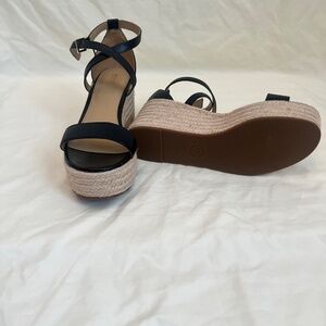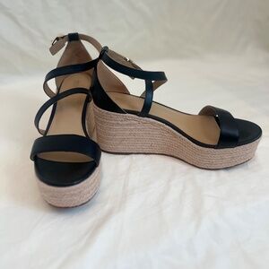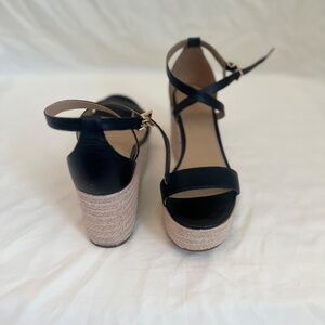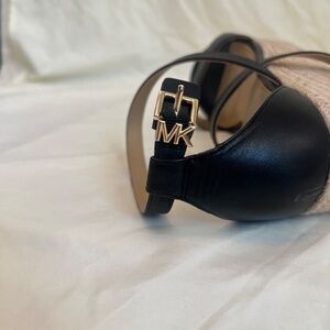 These wedges are an every day essential. 100% leather with a Jute type heel. Designed with a gold MK buckle fasten and an open toe. Worn 1 time