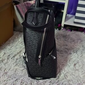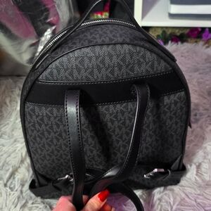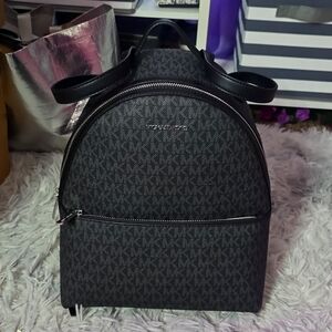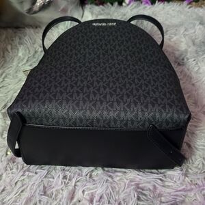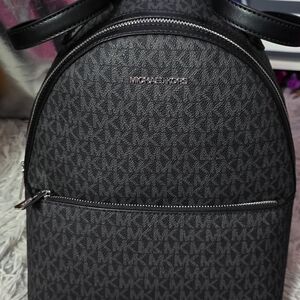 Stylish Michael Kors backpack. Features signature MK pattern. Sleek black design. Perfect for everyday use.