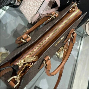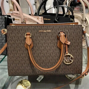 Michael Kors Sheila Medium Center Zip Satchel Bag Color: Brown NWT New with the tag authentic • Satchel • Faux leather • 88.92% coated canvas/11.08% polyester • Gold-tone hardware • 11"W X 8"H X 3.25"D • Handle drop: 4" • Interior details: back zip pocket, 2 front slip pockets • Lining: 100% polyester • Zip fastening • Imported