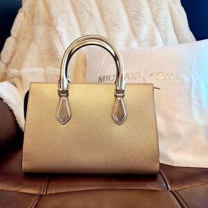 The always chic Michael Kors Sheila satchel in metallic pale gold. This bag is brand new with tags. Features elegant handles, crossbody strap, and signature charm. Perfect for elevating any outfit, day or night!