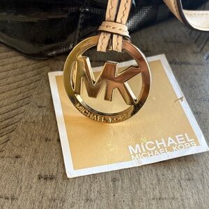 Stylish tote with glossy black finish. Cream handles add elegance. Perfect for daily use.