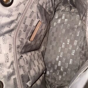 This Michael Kors shiny pewter tote is in excellent pre‑loved condition and features a subtle stamped MK-style pattern that adds texture and designer-inspired style. The beige handles offer a neutral contrast, making it easy to pair with just about anything in your fall wardrobe 🍂