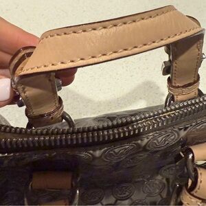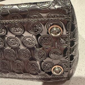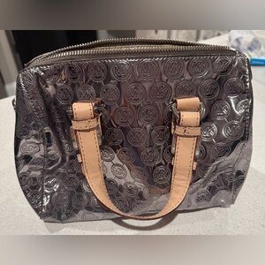 Stylish Michael Kors satchel with a shiny silver finish. Features tan leather handles. Embossed MK logo design. Please note the wear on the inside lining on the pictures. The exterior is in excellent condition.